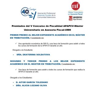 Con inmensa alegría anunciamos que ya se han adjudicado los galardones de la V Edición de los Premios Fiscalidad APAFCV-Máster Universitario en Asesoría Fiscal-UMH del curso 2024-2025.