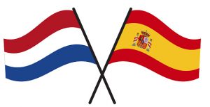 Netherlands and Spain Flags Crossed And Waving Flat Style. Official Proportion. Correct Colors.
